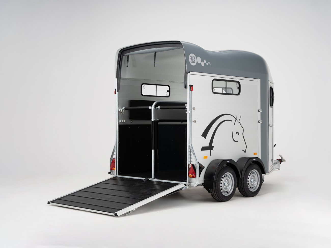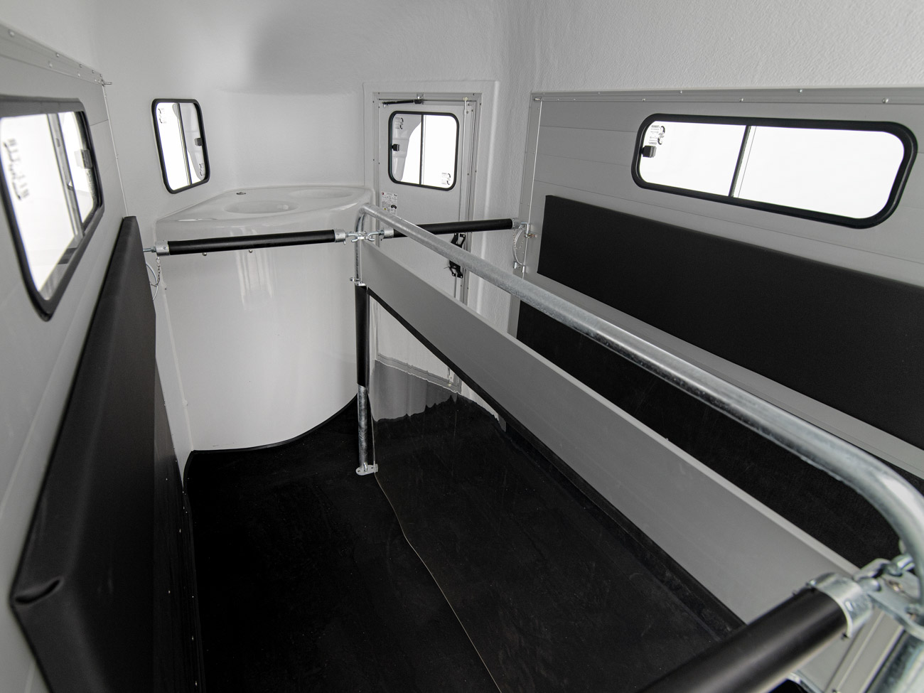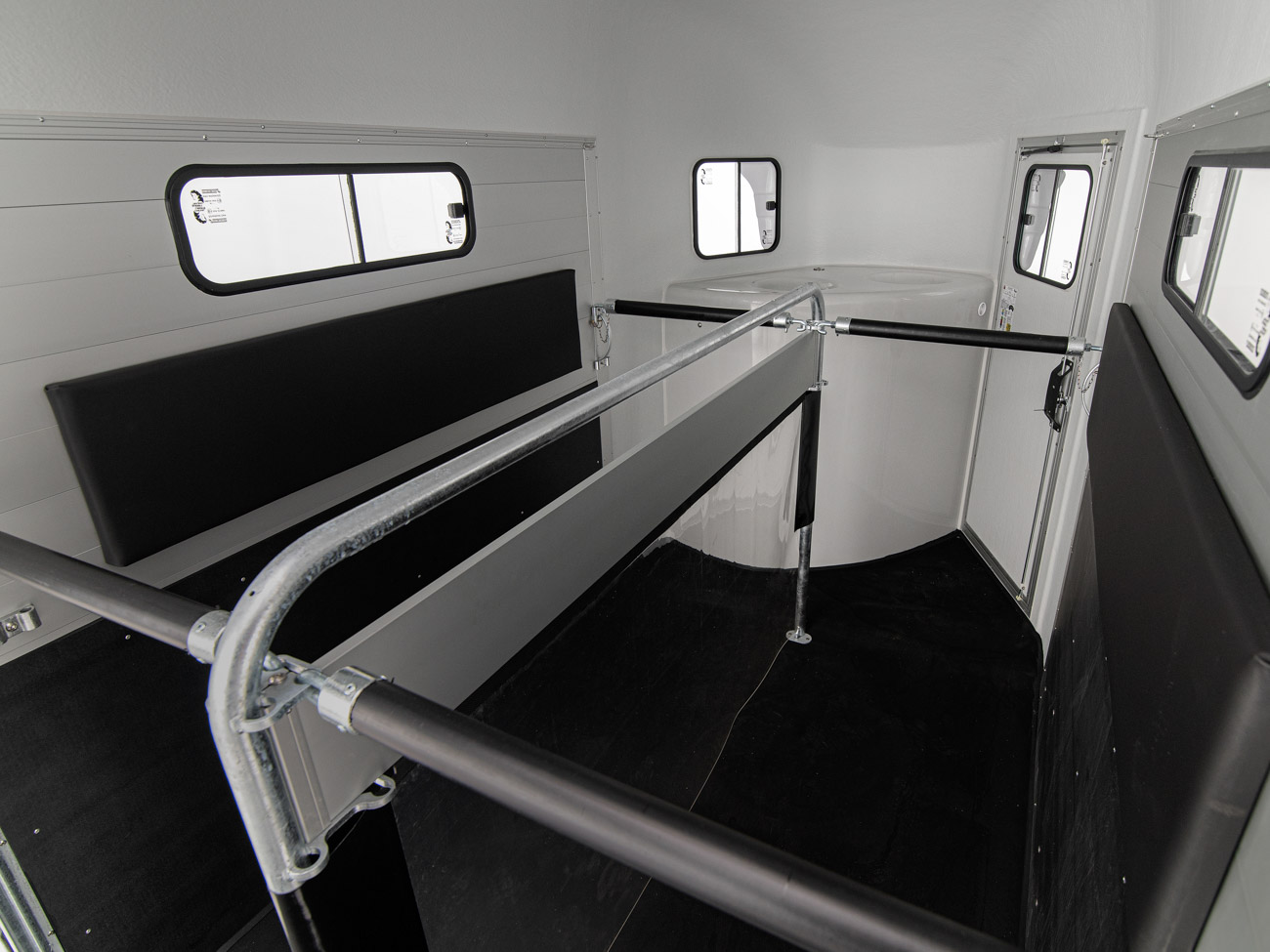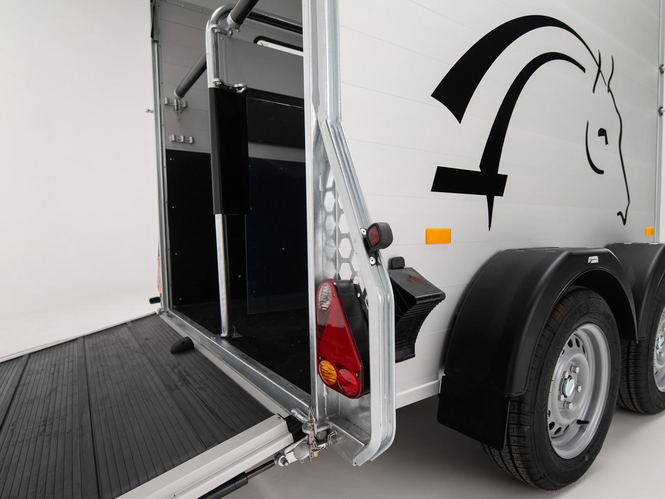 Cuenta con prestaciones de alta gama para una mayor comodidad de uso en la carga y descarga del ganado así como en el transporte. Tiene una puerta para jinete de acceso completamente vertical, luz interior incorporada de serie, separaciones interiores para llevar dos caballos con toda seguridad. Además, todas las partes metálicas están acolchadas, y tiene cojines laterales para proporcionar todo el confort a los animales.