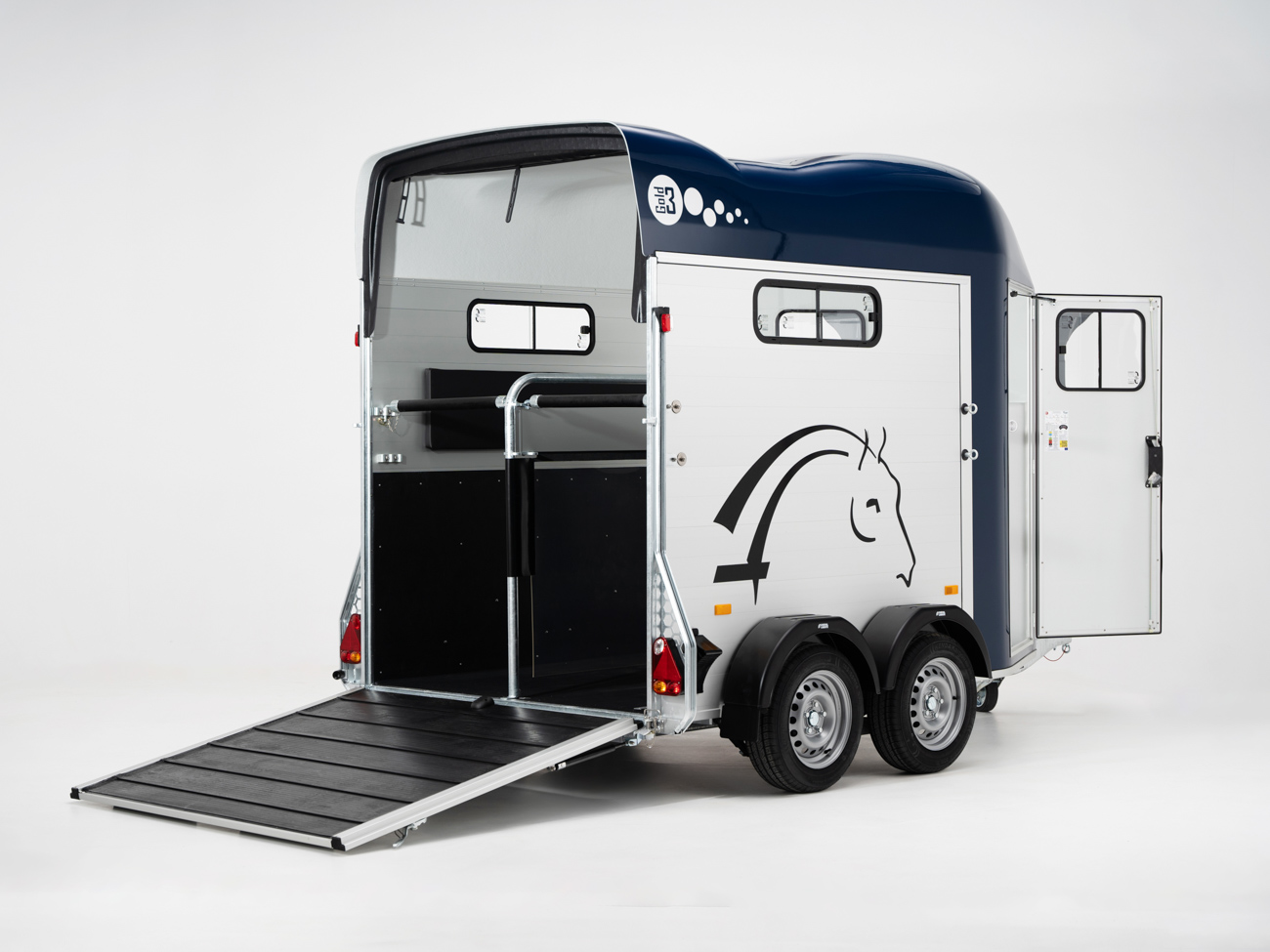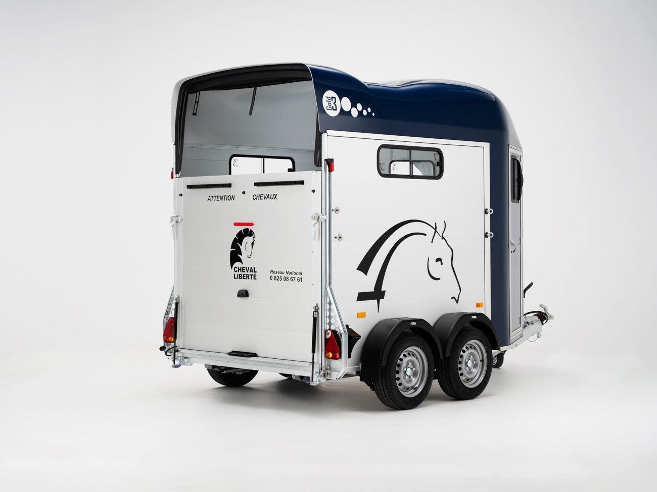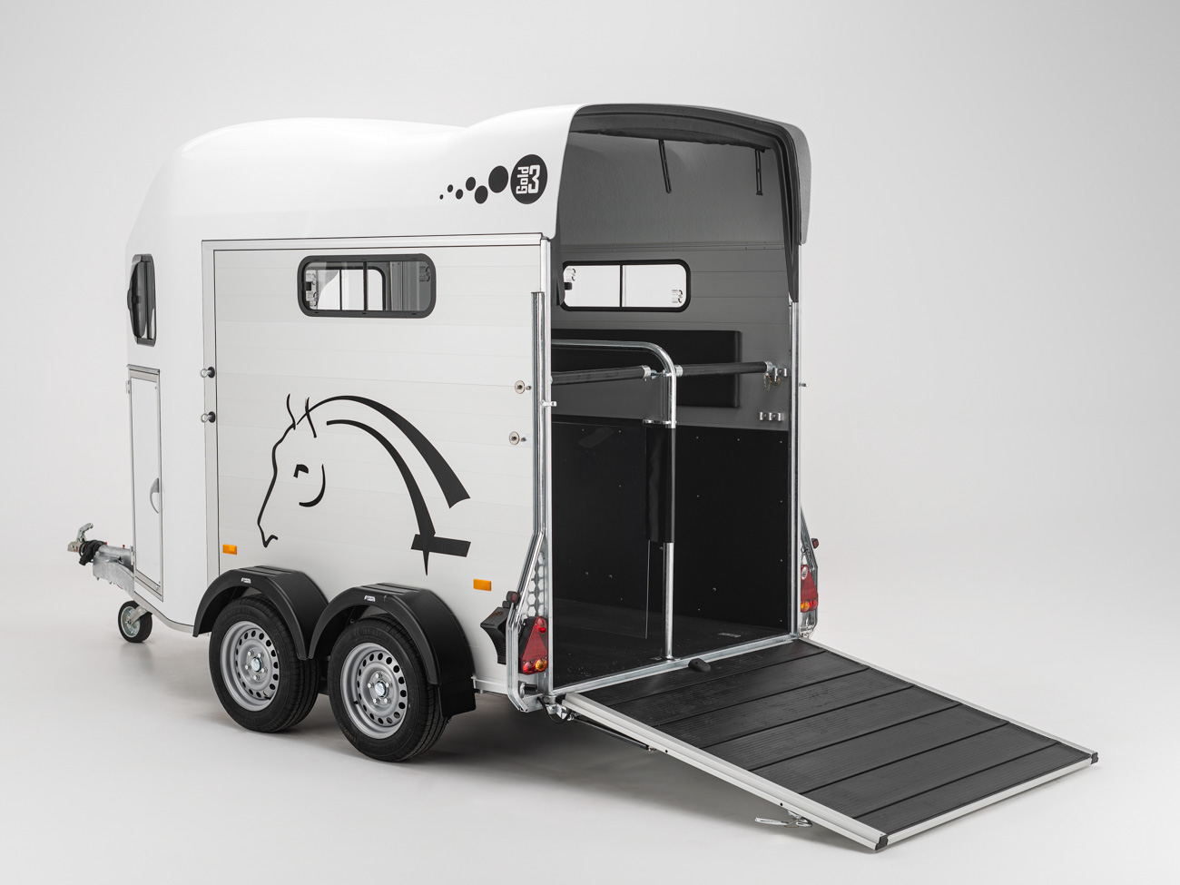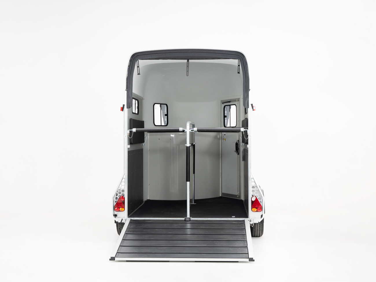Cuenta con prestaciones de alta gama para una mayor comodidad de uso en la carga y descarga del ganado así como en el transporte. Tiene una puerta para jinete de acceso completamente vertical, luz interior incorporada de serie, separaciones interiores para llevar dos caballos con toda seguridad. Además, todas las partes metálicas están acolchadas, y tiene cojines laterales para proporcionar todo el confort a los animales.