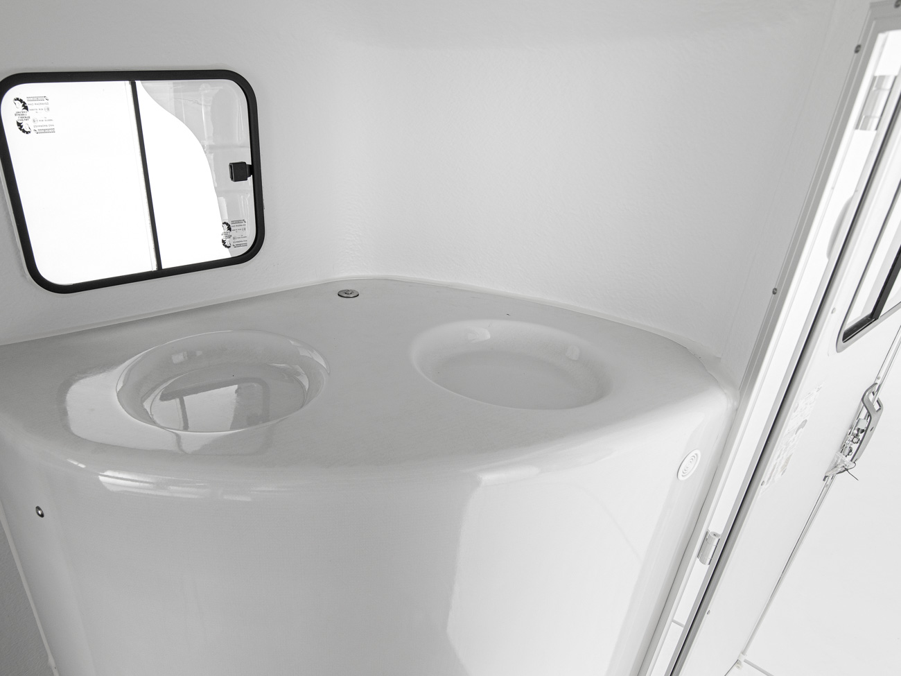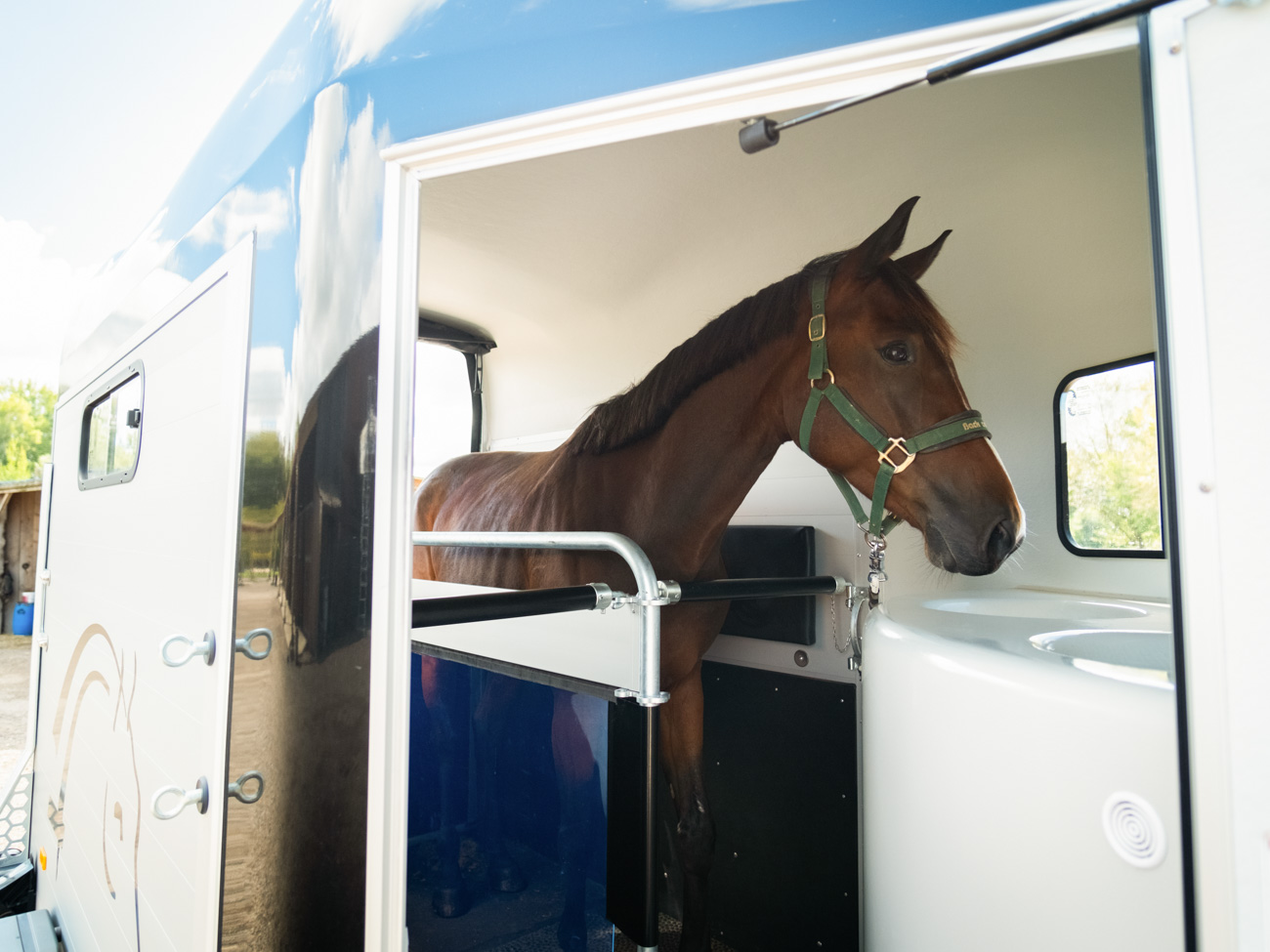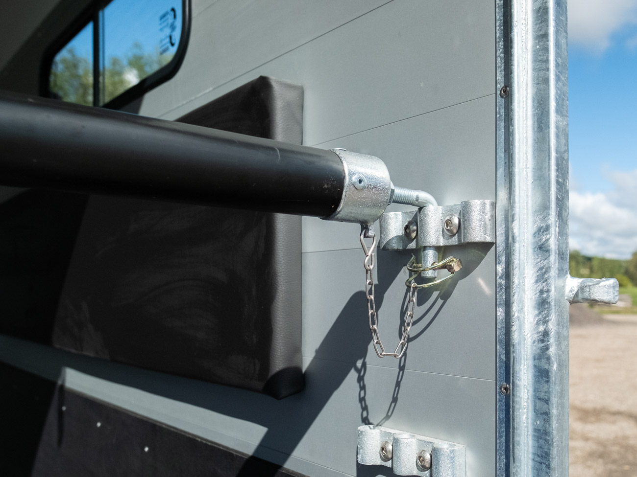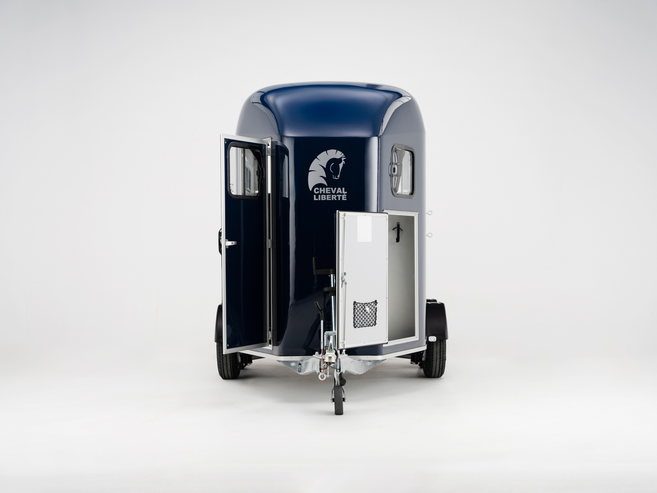 Cuenta con prestaciones de alta gama para una mayor comodidad de uso en la carga y descarga del ganado así como en el transporte. Tiene una puerta para jinete de acceso completamente vertical, luz interior incorporada de serie, separaciones interiores para llevar dos caballos con toda seguridad. Además, todas las partes metálicas están acolchadas, y tiene cojines laterales para proporcionar todo el confort a los animales.