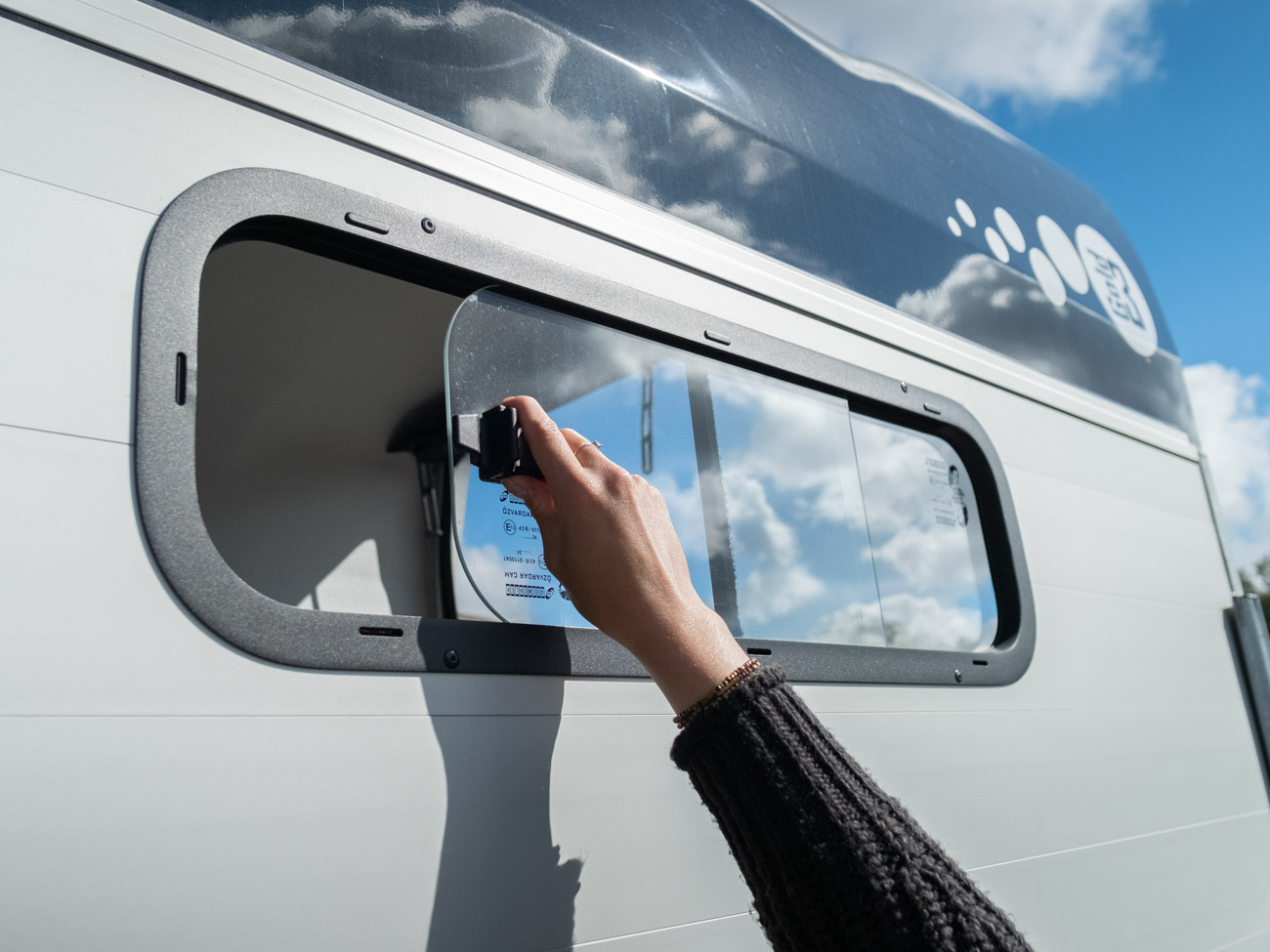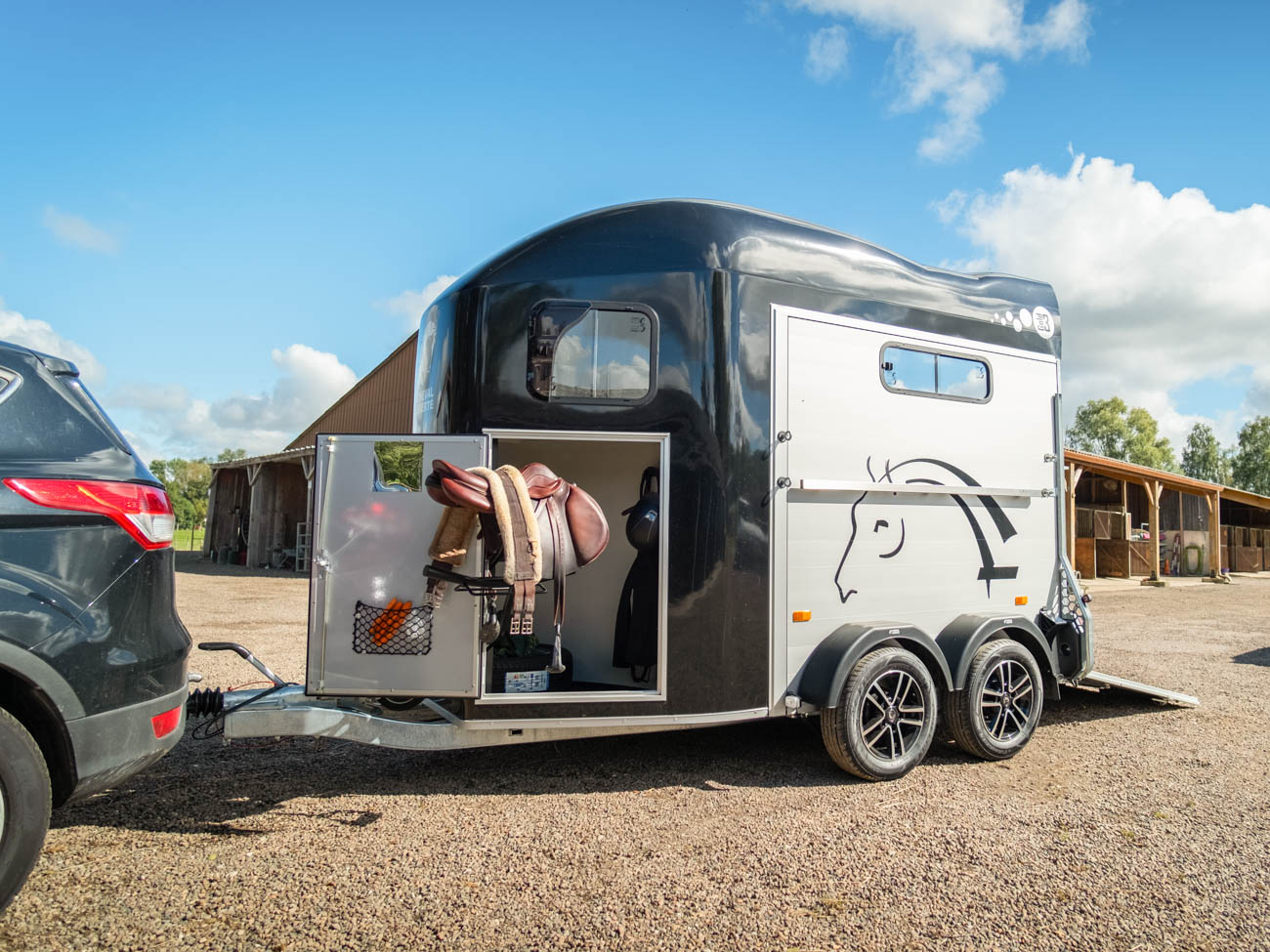 El modelo GOLD 3 presenta una prestación muy destacada respecto a otros remolques van para caballo. Se trata de una puerta lateral independiente que cuenta con un gran compartimento para guadarnés, así como con dos compartimentos para las sillas de montar, un cuenco para colocar comida y un espejo en la puerta lateral.
