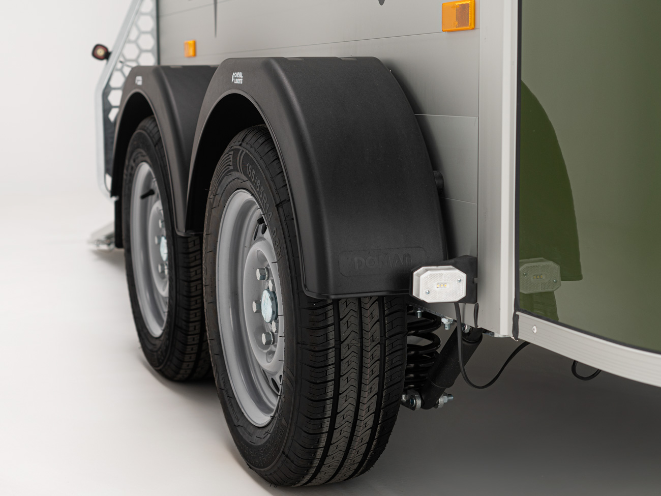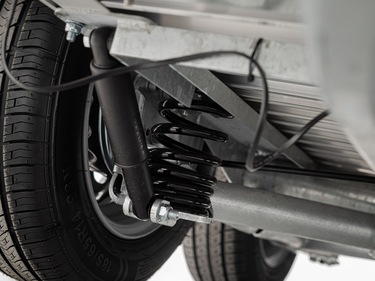 Este remolque Van tiene la opción de homologarse a 2600 kg o bien a 2000 kg dependiendo del modelo que se escoja, variando también el precio. Está equipado con 2 ejes KNOTT de 1000 kg muy reforzados, que le proporcionan una mayor estabilidad en la conducción al repartir el peso sobre ellos en lugar de cargarlo sobre la bola del vehículo tractor. El sistema de suspensión PULLMAN V2, equipado con 4 muelles, le proporcionan una mayor calidad de conducción.