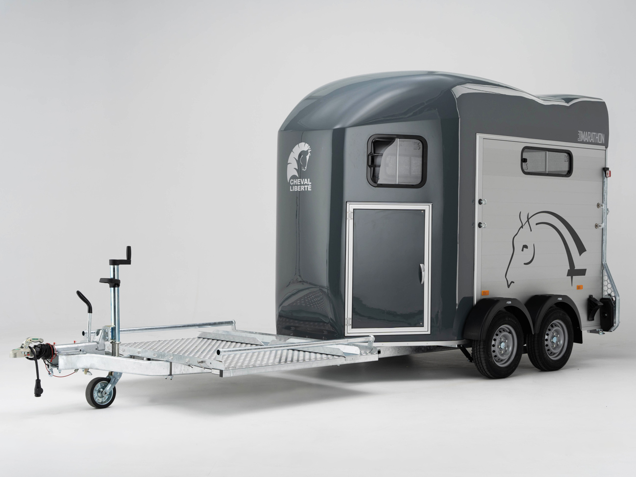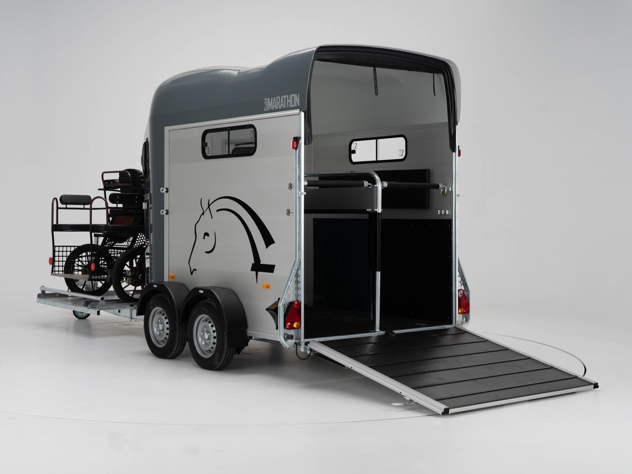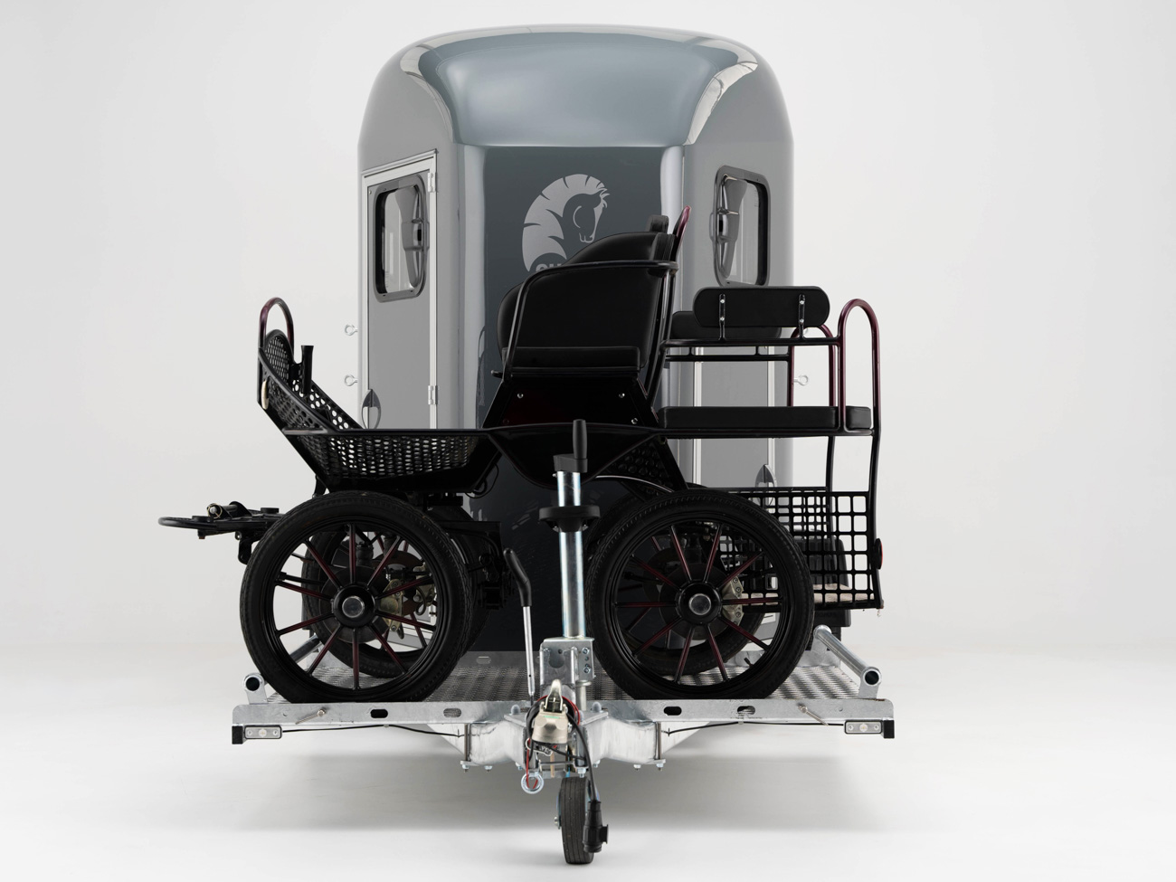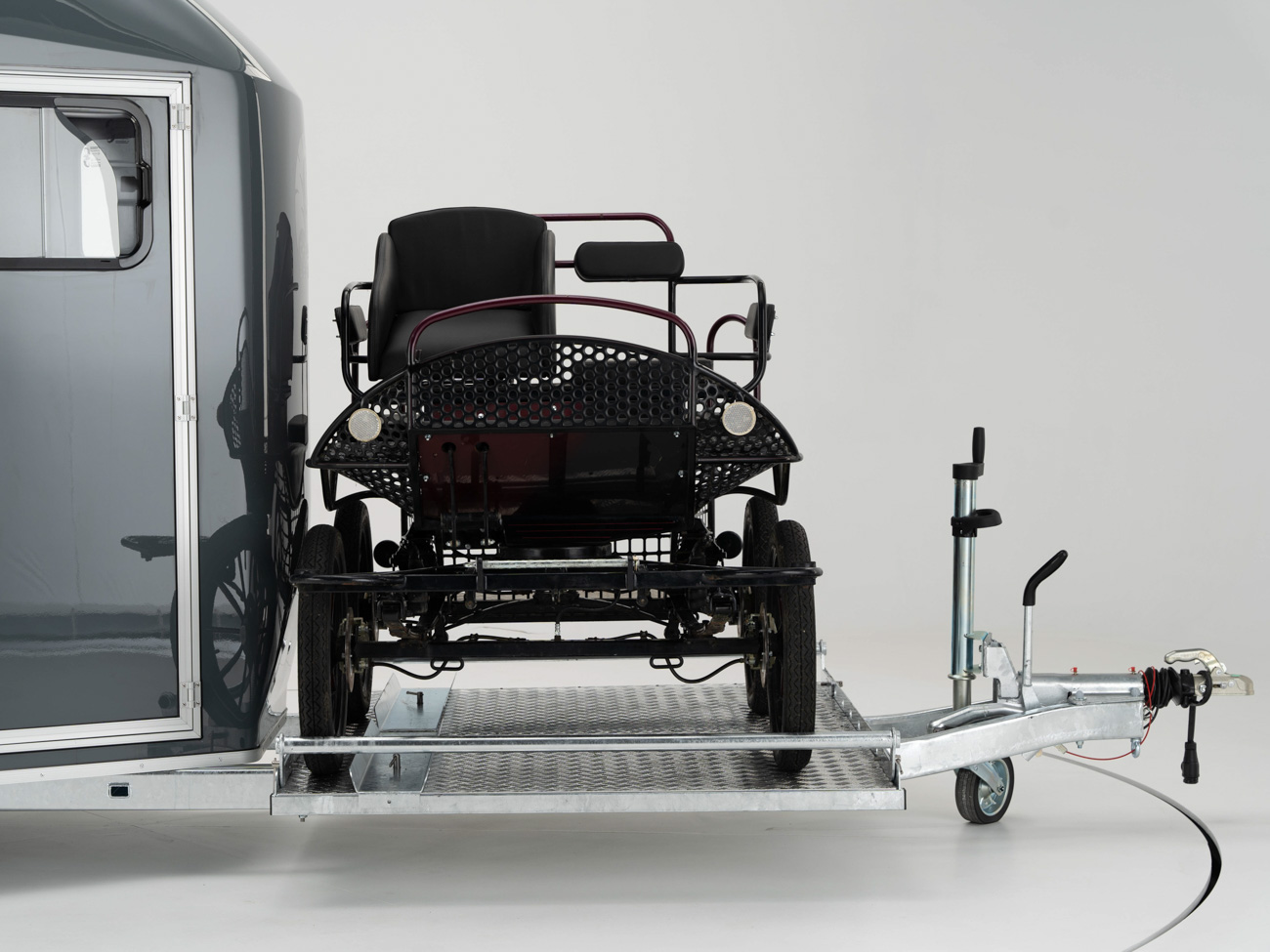 El modelo de remolque para 2 caballos Gold Hippomobile destaca entre los remolques Van para caballo porque está equipado con una plataforma para transportar un carro marathon, además de tener capacidad para dos caballos.