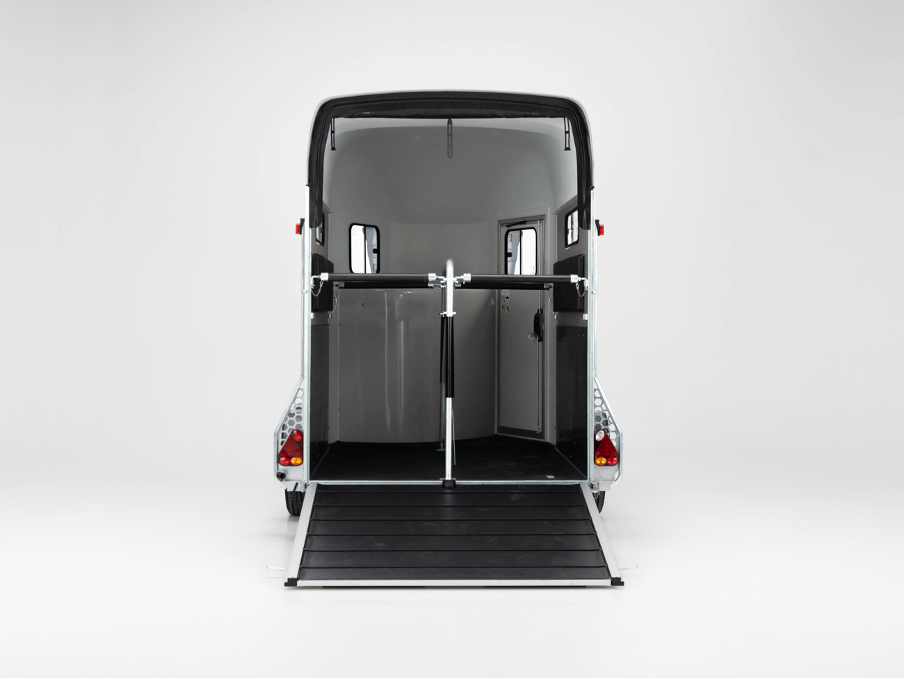 Para un fácil acceso al remolque, el modelo GOLD HIPPOMOBILE incorpora una puerta delantera y otra trasera tipo puerta/rampa. También cuenta con una lona para cerrar el remolque con Airtech roller plegable.